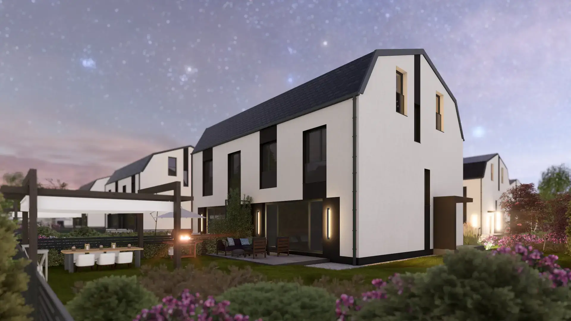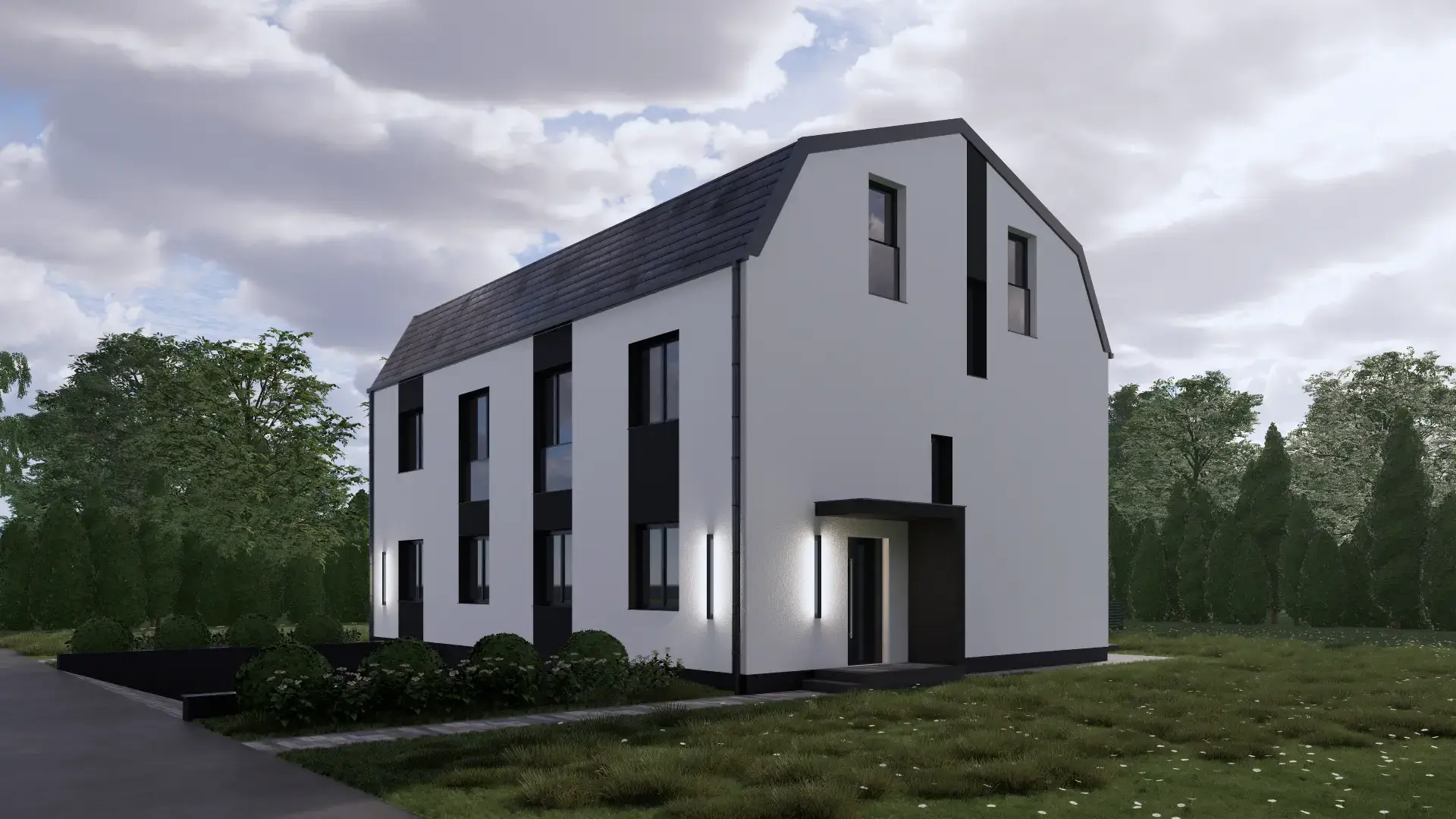 Bryła budynku nawiązuje do nowoczesnego stylu skandynawskiego, łącząc prostą, geometryczną formę z elegancją i funkcjonalnością. Charakterystyczny, przełamany dach mansardowy nadaje inwestycji unikalny charakter, a stonowana kolorystyka – biała elewacja podkreślona grafitowymi akcentami – tworzy harmonijną, minimalistyczną kompozycję. Wysokiej jakości materiały elewacyjne i starannie zaprojektowane detale gwarantują trwałość i ponadczasowy wygląd.