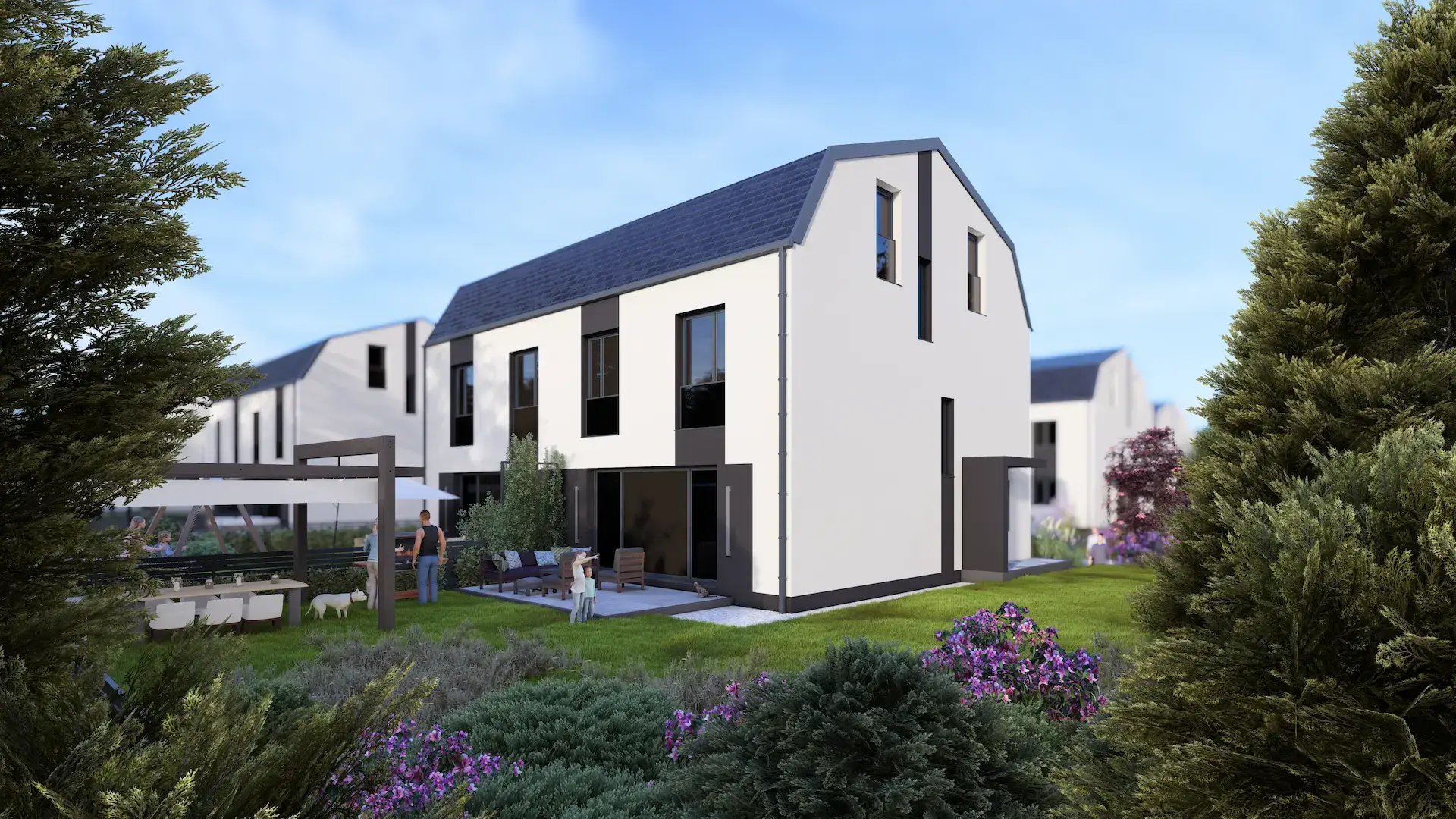 Duże przeszklenia od strony ogrodu zapewniają naturalne doświetlenie wnętrz i pozwalają cieszyć się pięknem zieleni o każdej porze dnia. Otwarta strefa dzienna płynnie łączy się z prywatnym tarasem oraz słonecznym, około 300-metrowym ogrodem, który przynależy do każdego domu. To idealne miejsce zarówno do rodzinnego wypoczynku, jak i swobodnej rekreacji na świeżym powietrzu.